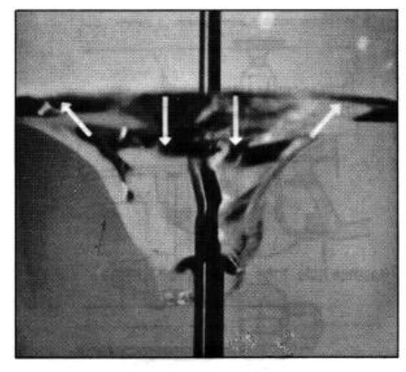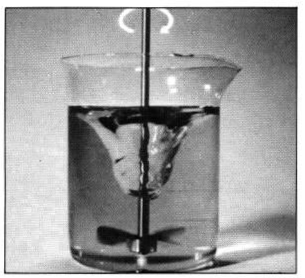 Let us try some experiments using the simple device shown on the left. When the impeller at the bottom of this device is turned, water also turns. This motion produces a depression in the water surface which is greatest at the center and least at the periphery. The reason for this is that water moves outwards under the centrifugal force resulting from the turning motion, the water pressure decreases at the center and the peripheral pressure increases.