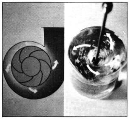 The volute pump is almost the same as this device in principle. As demonstrated in the above experiment it operates in such a manner that