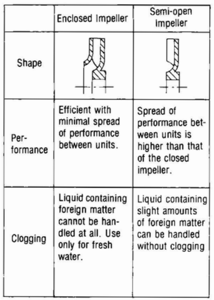 The types of impeller which are most generally used on the volute pump include the enclosed and semi-opened types. A comparison of both types is shown in the table at below.