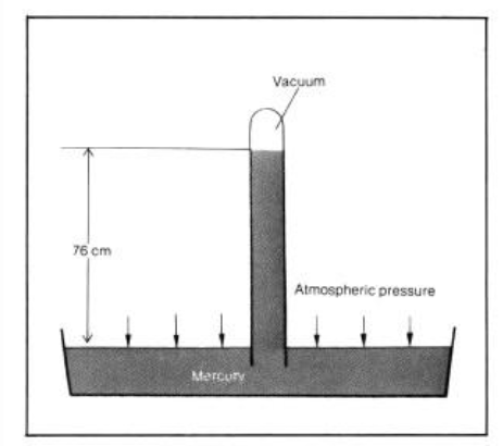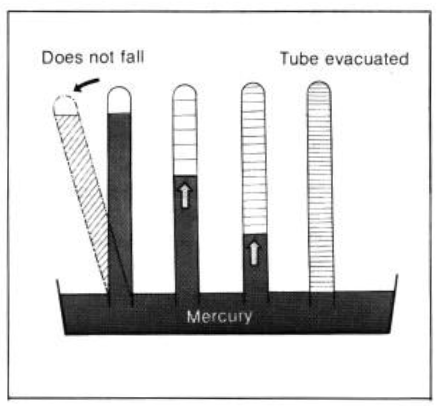 When the upper space of a glass tube of 1 m in length which is standing in a mercury bath is evacuated, mercury rises up the tube to a certain height. The level of the mercury does not fall even if the tube is tilted. This is because the mercury in the tube has been raised by the atmosphere which acts on the mercury surface of the bath, and the tube is kept at equilibrium.