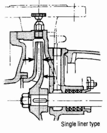 The single liner type is used with applications requiring only a small volute pump handling low pressures. This is on account of the fact that the axial thrust is low and can be adequately supported by bearings.