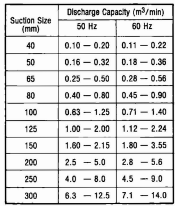 Standard discharge flow rates together with corresponding pump suction opening diameters are given in the appropriate Japanese Industrial Standards (JIS). Extracts from relevant Japanese Industrial Standard (JIS)