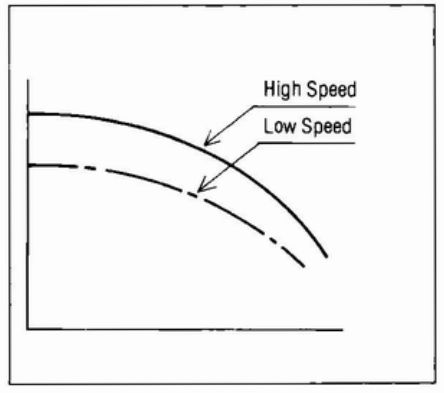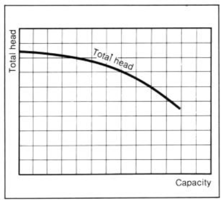 When the discharge characteristics are graphically represented using the vertical axis for the head and the horizontal axis for the discharge flow rate, the resulting curve droops as it proceeds to the right.