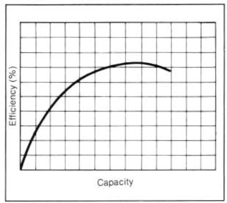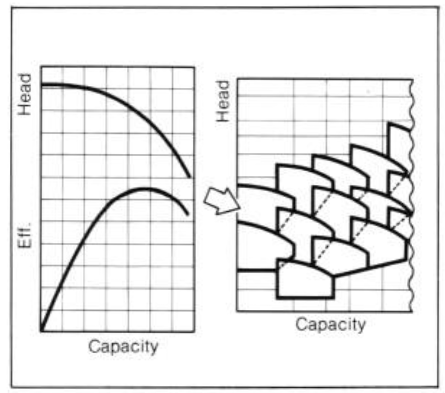 When the efficiency characteristics are graphically represented using the vertical axis for the efficiency and the horizontal axis for the discharge flow rate, the curve shown in the left hand column is obtained.