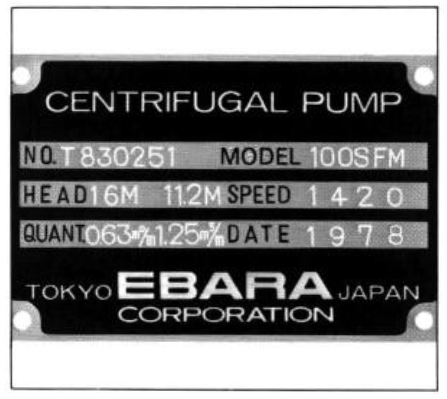 A nameplate showing Pump performance is attached thereto. The discharge flow rate, head, speed, motor output, etc. are indicated on the nameplate and guaranteed by the manufacturer.