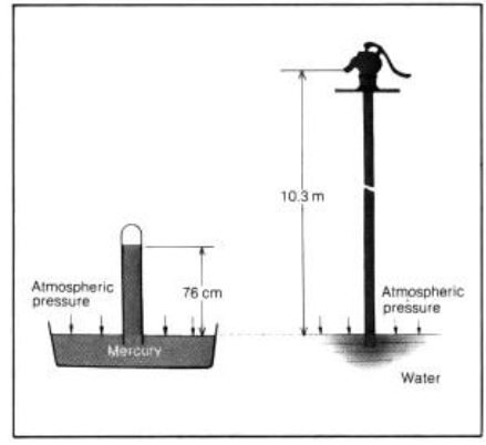 When the same experiment is applied to water, the water rises up to a height of 10.3m under atmospheric pressure owing to the fact that the specific gravity of water is lower than that of mercury.