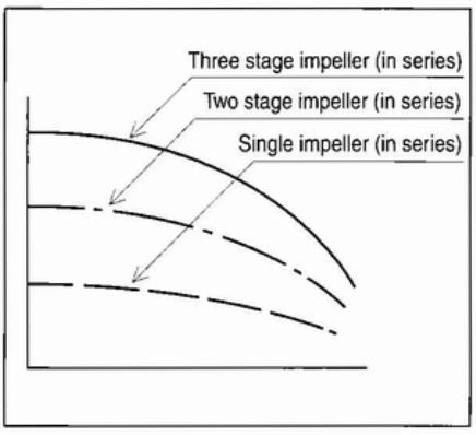The performance of a pump varies with the number of impellers. With a multi-stage volute pump a number of impellers are arranged in series to enhance the head. With the double suction volute pump, two special type impellers are arranged in parallel to increase the discharge flow rate.