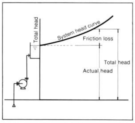 To obtain the total head, it is necessary to painstakingly calculate the head losses in detail, while the actual head can be quite easily determined. Generally, head losses are proportional to the square of the flow rate. When the characteristics are graphically represented using the vertical axis for head losses and the horizontal axis for flow rate in the previously described manner a quadratic curve is obtained which rises as it proceeds to the right. This is known as the system head curve