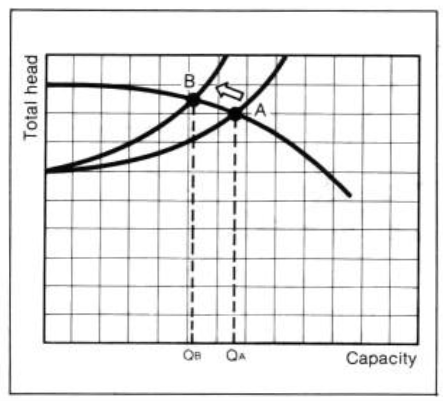In this case, the resistance curve varies as shown in the left hand graph and the pump is operated at the intersection between the head and resistance curves so the operating point shifts from point A to B and the discharge flow rate decreases from QA to QB. Since the resistance increases also when rust is formed and/or scale is deposited on the walls of the water feed pipes, the discharge flow rate will decrease for the same reason as when the gate valve is throttled