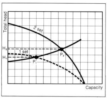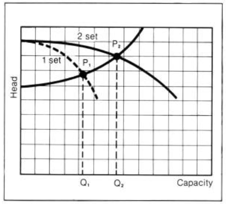 In some cases pumps are operated in parallel or series in order to increase the discharge flow rate or head. This is a method whereby two or more pumps are simultaneously operated and is basically the same as the contents of section V,”PERFORMANCEVARIATIONWITH THE NUMBER OF IMPELLERS”