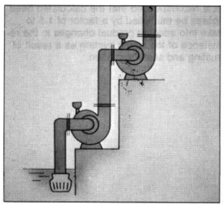 When two pumps which have the same characteristics are operated in series, the head theoretically becomes double that of a single pump for the same discharge flow rate point. In actual fact, however, the head does not double because the pump is operated at the intersection between the serial characteristic and resistance curves. Series operation be comes more effective as the resistance curve becomes steeper