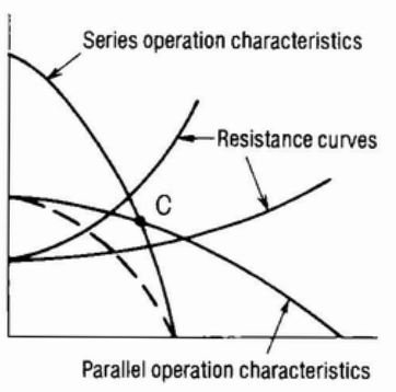 When the resistance curve passes below the inter section between the parallel and serial operation characteristics, parallel operation is effective and