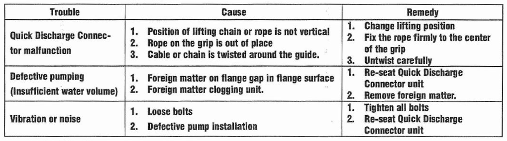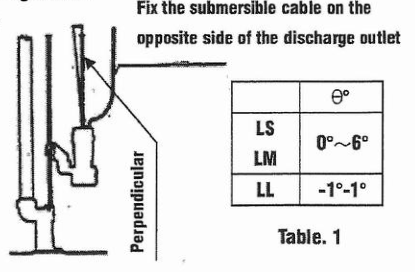 To confirm setting, lift the pump body about 2 inch and lower again two to three times. Ensure that support chain or rope and cables do not interfere with operation. This now completes the installation. During installation, proceed very carefully and take every precaution to prevent the unit and the pump form being dropped. Pump should not be Inclined in excess of values eo shown in the table 1 at right when raising or lowering.